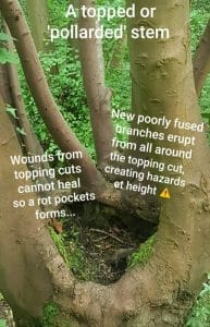 Tell your tree surgeon you don’t want lopping or topping and ask to see pictures of their natural target pruning work to ensure you have chosen the right contractor. If your trees have already been badly pruned, make sure they are maintained every two or 3 years to prevent stress regrowth from becoming hazardous.