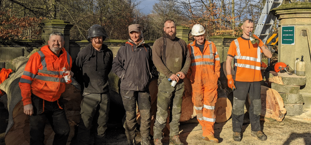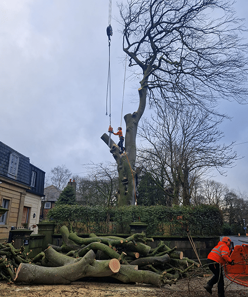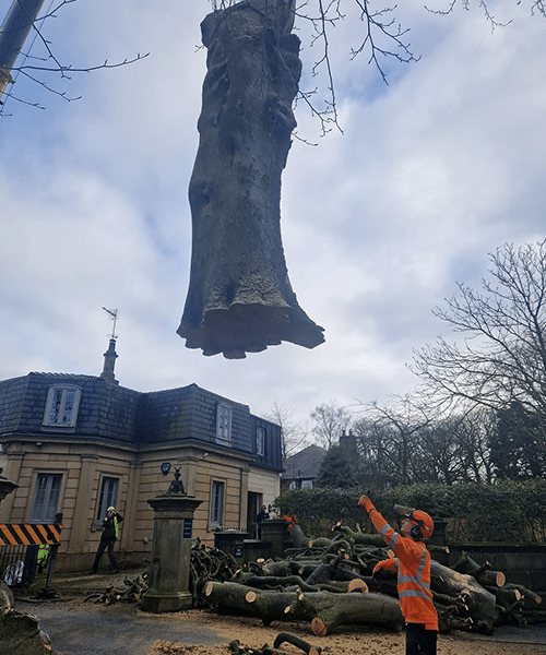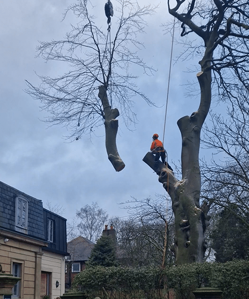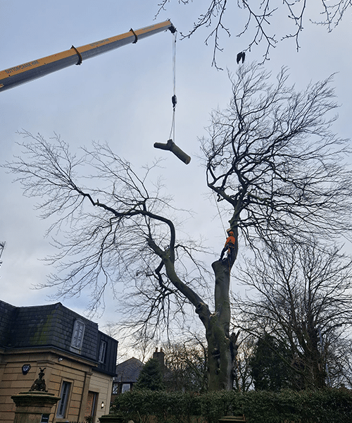 This huge beech tree was protected by the tree preservation order. We were asked to inspect it and we could see a huge cavity that had formed in the wound of a large limb removal. The cavity was holding so much water it was leaking out through a crack in the stem. There was also fungus around the base of the tree indicating root decay. An application to remove the tree was raised and approved by the tree officer at Stockport Council. There was just enough access for a crane to assist the removal. The road was closed for the day and the tree was dismantled, section by section and lowered skilfully to the ground. It was loaded shortly after and taken away to be recycled .