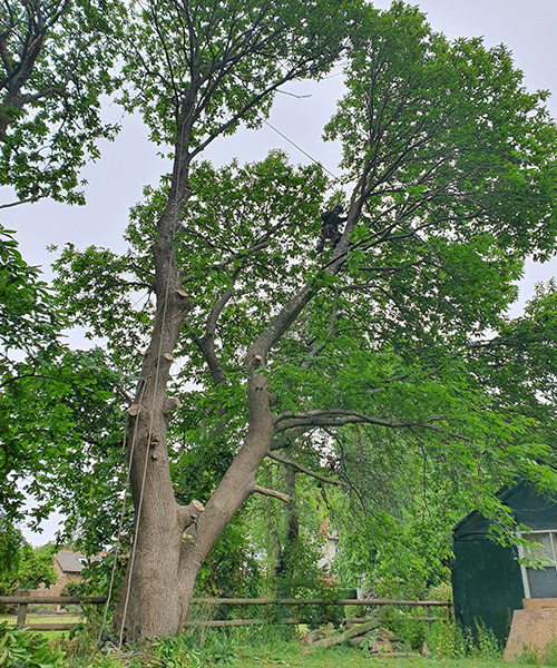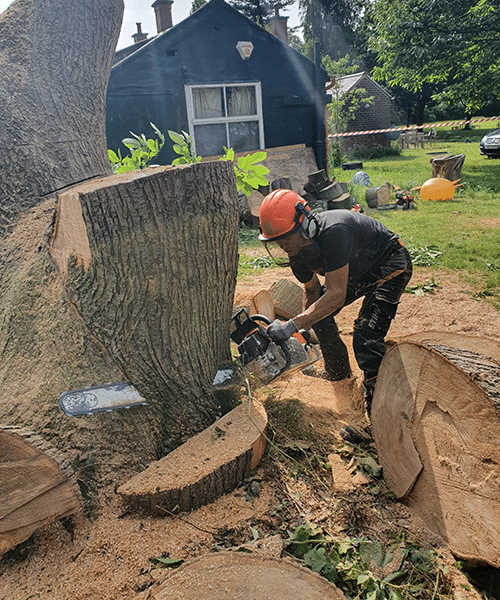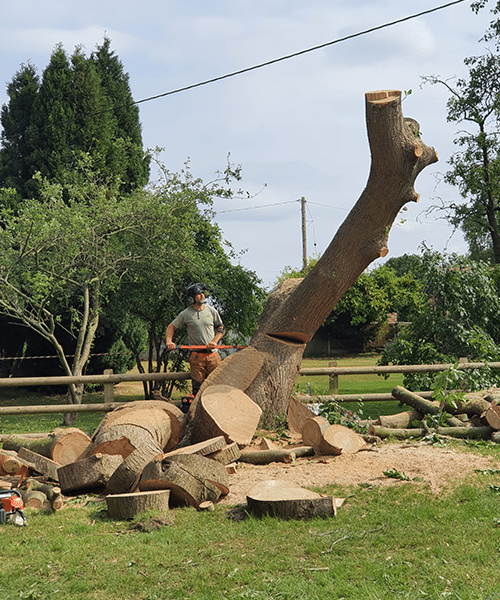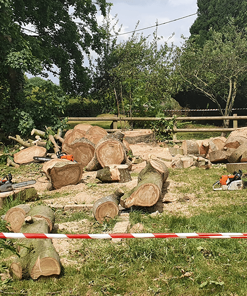These trees were in the way of a permitted development. They had to be dismantled because of overhead cables. They were brought down in sections until they were low enough to fell under the cable. The customer kept the logs for his fire and we cut them up ready for him to process with his hydraulic log splitter. If this was our property we would have liked to keep these trees, as sweet chestnuts are the ones that are traditionally roasted and eaten at Christmas!